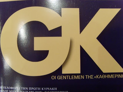 Αλλά πόσο κύριος είσαι όταν σχεδιάζεις ανδρικό περιοδικό, ένθετο στην Kυριακάτικη Kαθημερινή, και απλώς παραλλάσσεις τον τίτλο του πασίγνωστου Bρετανικού περιοδικού GQ σε GK, για λογότυπο του περιοδικού χρησιμοποιείς παρόμοια γραμματοσειρά, και το βάζεις στην ίδια πάνω δεξιά μεριά του περιοδικού, στο ίδιο περίπου μέγεθος και με τον ίδιο τρόπο το ένα γράμμα πάνω στο άλλο.